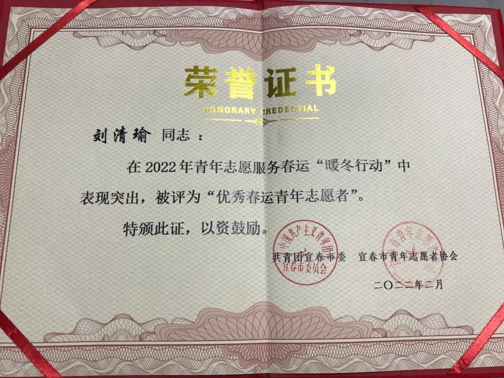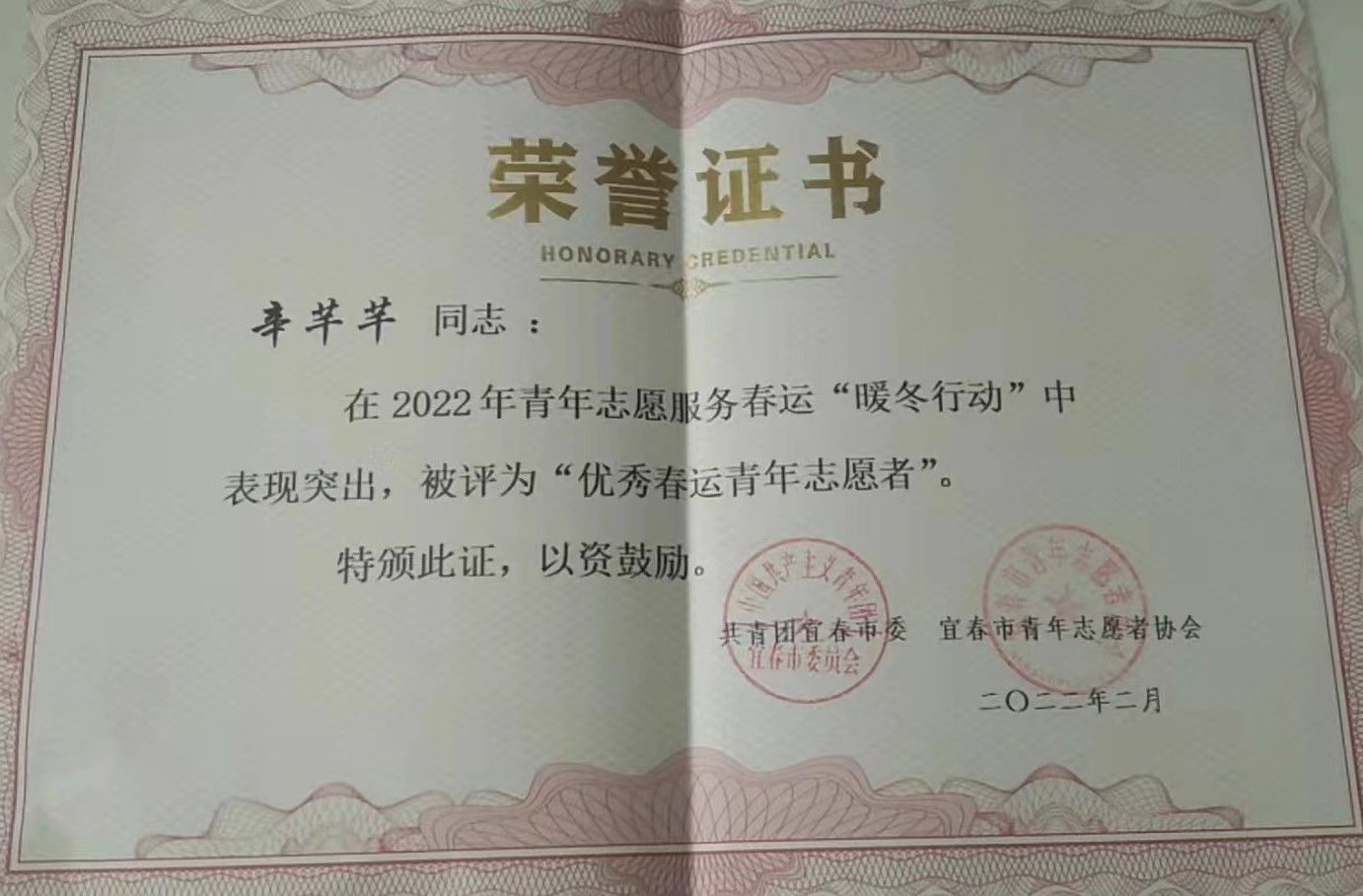 本站讯(国际教育学院 朱媛)为响应团省委动员大学生开展春运“暖冬行动”、“返家乡”社会实践等活动,大力弘扬“奉献、友爱、互助、进步”的志愿精神,国际教育学院团员积极响应号召,其中英语教育18502 班辛芊芊和英语教育19501班刘清瑜在宜春火车站坚持志愿服务长达90小时以上,并且热情贴心的服务受到了广泛好评,最终被授予“优秀春运青年志愿者”荣誉称号。