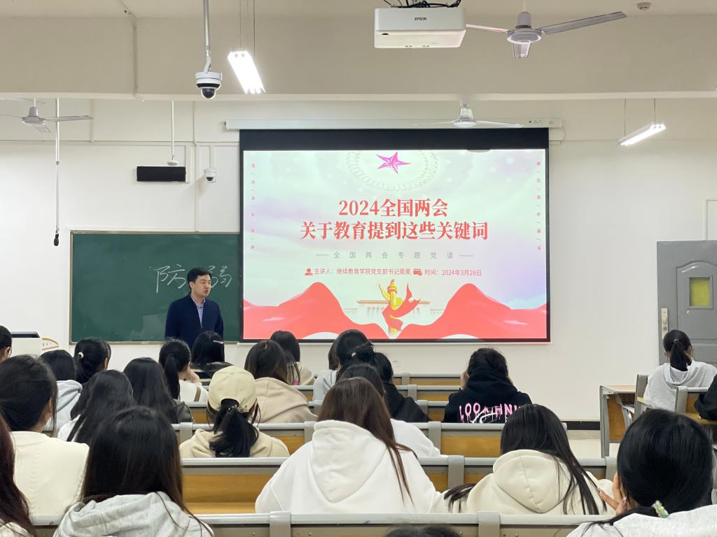 为深入学习贯彻2024年全国两会精神,推动买球官网学生对两会教育热点的关注。3月28日晚,继续教育学院党支部书记周昊为继续教育协会学生讲授“2024年全国两会关于教育提到这些关键词”专题党课。继续教育协会共60余名学生参加。