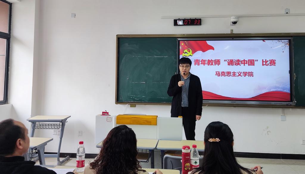 本站讯(马克思主义学院 张保揭)为传承和弘扬中华优秀传统文化,引导青年教师亲近中华经典,4月29日下午,马克思主义学院于正心楼B219开展青年教师“诵读中国”经典诵读比赛。马克思主义学院全体教师到场观赛。