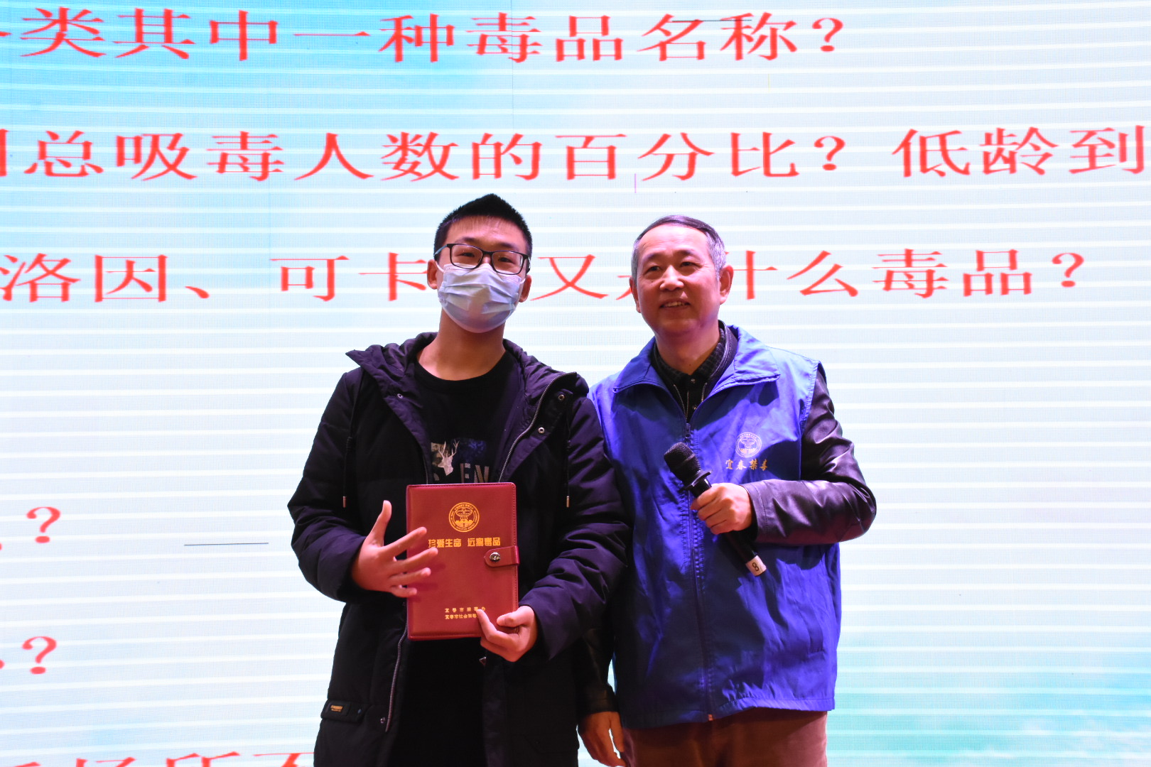 在全体奏唱国歌后,兰志英说明了开展校园毒品预防宣传教育的重要性和紧迫性,并对奋战在禁毒一线的工作人员表示崇高的敬意。随后,主讲人苏飞扬从什么是毒品、为什么要禁毒、如何预防毒品三方面展开讲解,从毒品的起源到发展,从民族英雄林则徐虎门销烟到当今千万缉毒警察的默默付出,结合生动形象的历史故事和真实典型的禁毒案例,讲述了当今青少年毒品预防宣传教育的紧迫性和必要性,呼吁同学们要坚决做到警惕诱惑、明辨是非、对毒品坚定说“不”!