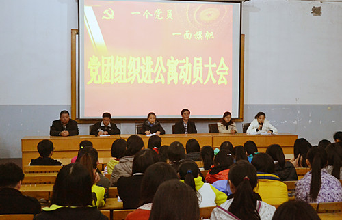 会议在庄严的《国际歌》中开始。团总支书记陈雪莲宣读了《医学院党团组织进公寓活动方案》,阐述了党团组织进公寓活动的意义,介绍了活动的组织机构、工作目的和工作思路;并对工作内容及措施进行了布置。
