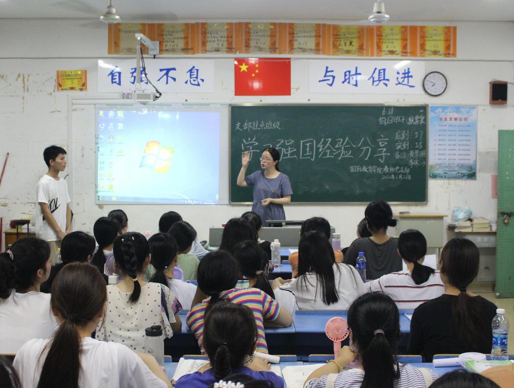 在完成了“学生学习感悟撰写”、“党员教师批阅研讨”两个阶段的活动后,在 6月21日晚,国际教育学院教师党支部、学生工作党支部党员带着各支部总结的指导意见,与部分非党员班主任进入班级与各班团支部共同开展“学习强国经验分享”支部挂点暨主题团日活动。