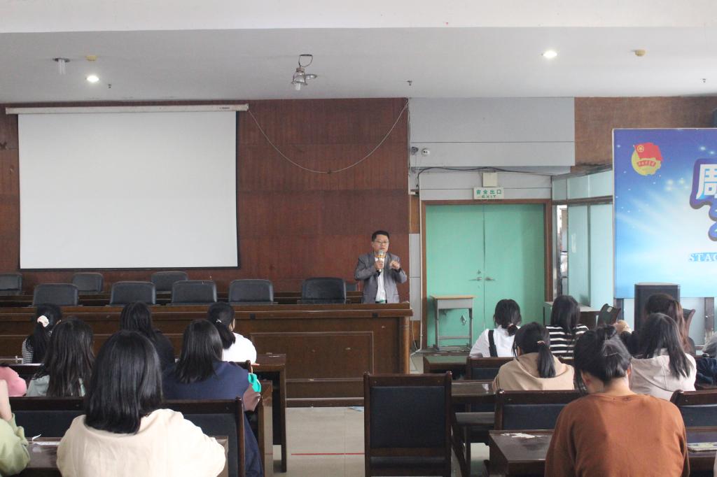 本站讯(国际教育学院 朱媛 学生记者 刘燕平)为进一步深化新生的专业认同感,强化专业自信,国际教育学院于10月12日下午在第一教学楼九楼学术报告厅和X506教室开展了新生专业思想教育活动。活动邀请了国际教育学院副院长肖勇和小学英语教育专业负责人李强担任主讲人,国际教育学院全体新生参加了此次活动。