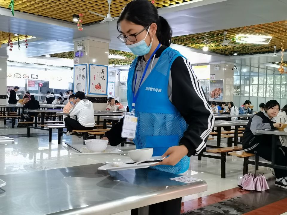 10月15日中午,国际教育学院的志愿者们来到了幸福食堂二楼,开展世界粮食日的主题宣传活动。志愿者们手里拿着“厉行粮食节约 践行绿色消费”和“反对食品浪费 崇尚节俭美德”的宣传标语站在食堂的不同位置,温馨提醒就餐同学:“要爱惜粮食,做到光盘,不能浪费哦!”并与之谈论了有关粮食日的话题。节约粮食不仅显示出对劳动、劳动者的尊重,更是一种节俭美德的传承与发扬。志愿者号召就餐同学“爱惜粮食,杜绝浪费”,争做勤俭节约风尚的传播者、实践者、示范者。