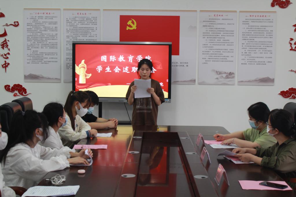 本站讯(国际教育学院 朱媛)为深入贯彻落实学生会组织深化改革的要求,推动完善学生会组织述职评议制度,并总结这一学期学生会工作成效经验,提升学生会工作水平,国际教育学院于6月3日下午在科技综合楼401会议室举行了国际教育学院学生会2022年上半年述职评议大会。出席会议的有院党总支书记刘海云、院党总支副书记杨敏、院学工科科长杜欣宇及各班学生代表,会议由院团总支书记朱媛主持。