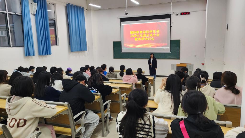 本站讯(国际教育学院 杨琨 学生记者 汪彦妤)为深入学习贯彻习近平新时代中国特色社会主义思想,持续深化学生组织改革,增强学生组织的引领力、组织力和服务力,国际教育学院于3月28日晚在博达楼B101召开2022-2023学年第二学期学生会及学生社团全体大会暨春季培训会。会议由学院学生会主席团成员晏文洁主持,院团总支书记杨琨、院学生会及学生社团全体人员参与此次会议。