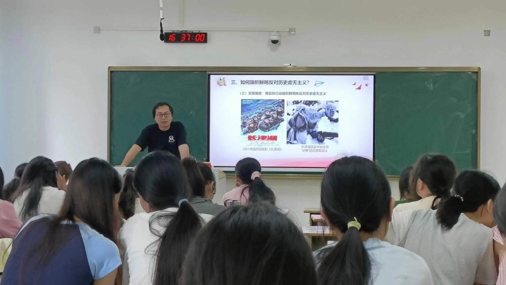 活动伊始,张莉彬老师以历史事件为导入,为大家讲述维护国家尊严的重要性;随后他以热点新闻举例,剖析了历史虚无主义的表现与危害,并从理论与实践的角度出发,号召大家认真学习党史国史,树立正确的国家观、历史观与民族观,旗帜鲜明反对历史虚无主义,强化理论知识、磨炼专业技能,争做可堪大任的新时代的有为青年。授课以张老师对大家的寄语作结,在同学们的心中留下了珍贵的精神财富。