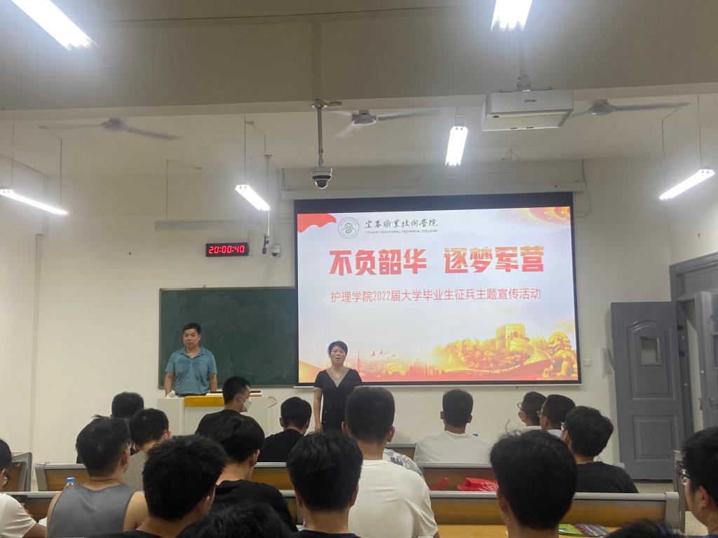 为推进国防和军队现代化建设,鼓励大学毕业生积极响应国家号召,踊跃报名应征入伍, 7月17日晚,护理学院于和济楼306教室开展“不负韶华,逐梦军营”2022届大学毕业生征兵主题宣传活动。活动邀请学校保卫处处长熊剑主讲,护理学院2022届毕业生150余人参加,活动由护理学院党总支书记胡蓉主持。