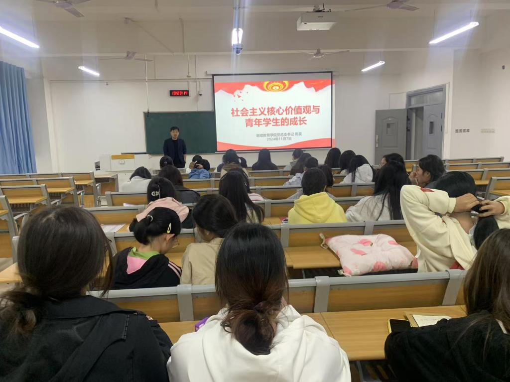 11月7日晚,继续教育学院党支部书记周昊为继续教育协会学生讲授“社会主义核心价值观与青少年的成长”为主题的党课。继续教育协会共50余名学生参加。