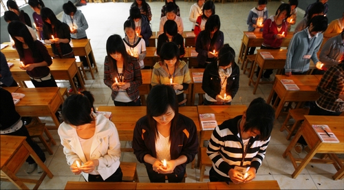 在教师的带领下,同学们点燃手中烛光,肃立在课桌旁,用默哀一分钟的方式送上了对遇难同胞的深深哀悼;同学们打着手语齐声歌唱的一首《感恩的心》,则捎去了大家对青海人民重建家园的美好祈福。