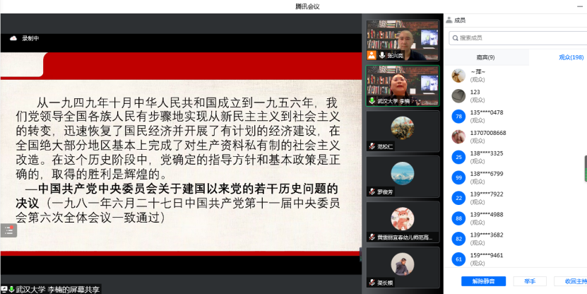 在专家导学环节,全国一级学会——马克思列宁主义经济学说史学会副会长,中宣部、教育部马克思主义理论研究和建设工程主要成员,教育部高校思想政治理论课教学指导会委员,武汉大学马克思主义学院博士生导师李楠教授应邀在线为教师作备课导学。李楠教授从“新中国的建立和新生人民政权的巩固”“抗美援朝、土地改革和镇压反革命的伟大成就”“‘三反’‘五反’运动和国民经济的恢复和发展”“确立人民代表大会等制度”“完成生产资料所有制的社会主义改造”“社会主义制度的确立及其深远意义”等六个方面,系统讲解了社会主义革命的伟大历程、历史成就和宝贵经验,李教授的讲解历史逻辑、理论逻辑、实践逻辑非常清晰,是一堂有深度、有厚度、有温度的备课导学示范课,对帮助老师们讲深讲透讲活“社会主义革命何以成功”这个专题提供了丰富的素材、立体的视角和辩证的方法论指导。