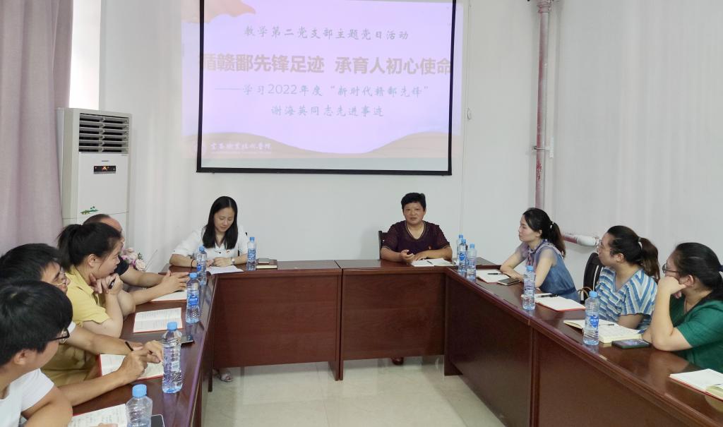 本站讯(教学第二党支部 卢凯)为持续推进党员先进性教育,大力弘扬“孺子牛、拓荒牛、老黄牛”精神,进一步激励党员教师见贤思齐、创先争优,8月26日上午,教学第二党支部召开党员大会暨主题党日活动,会议邀请了2022年度“新时代赣鄱先锋”谢海英同志做分享交流,由党支部书记彭慧洁同志主持,全体党员参加。