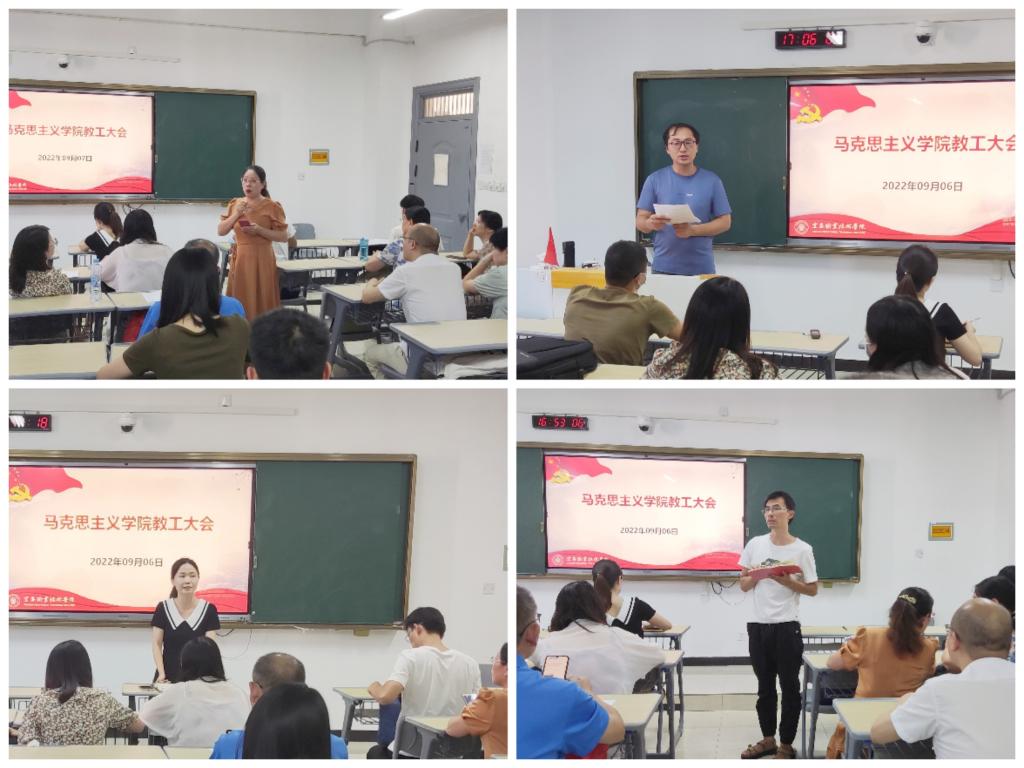 随后,马克思主义学院概论教研室主任张正芳、思想道德与法治教研室主任胡金兰、形势与政策教研室主任曾骏分别向教师介绍了新学期各门课程安排,并对教学工作提出具体要求。张莉彬补充说明了本学期的教学任务情况,并强调了教学管理的相关要求。