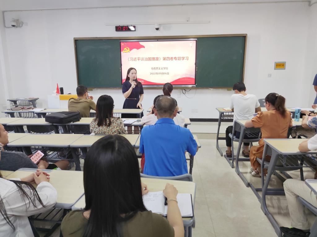 本站讯(马克思主义学院 宋丹丹 李自湖)为更好推进《习近平谈治国理政》(第四卷)进课堂、进教材、进师生头脑,保证新学期思政课教学等工作的顺利开展,马克思主义学院于9月6日下午在正心楼B301教室召开了教工会议。会议由马克思主义学院综合科科长张莉彬主持,全体思政课教师参加。