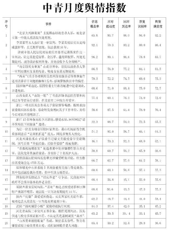 本期中青舆情指数显示,有6起案件的处置达到了60分以上。其中,“大兴摔童案”主犯被判死刑、李某某因强奸罪获刑十年和薄熙来一审被判无期徒刑,综合满意度位居前三。