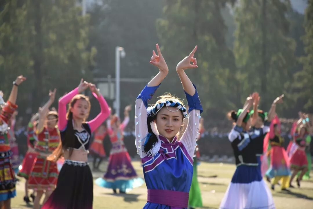 晴日当空,万里无云,在大家的期盼之下,医学院与校武术队的威风锣鼓、武术表演以及校学生会和校社团联合会带来的啦啦操率先开始,霎那间点燃了整片田径场的热情,磅礴的气势与热情洋溢的姿态直冲云霄!师范学院的《民族韵律操》独具一格、别有韵味,身着各色少数民族服装的他们铸成了田径场上最靓丽的风景线,将“五十六个民族是一家”的观念传递给每位师生。节目最后,师范学院新生代表的千人广播体操表演动作整齐划一,展现了师范学院昂扬向上的精神信念。