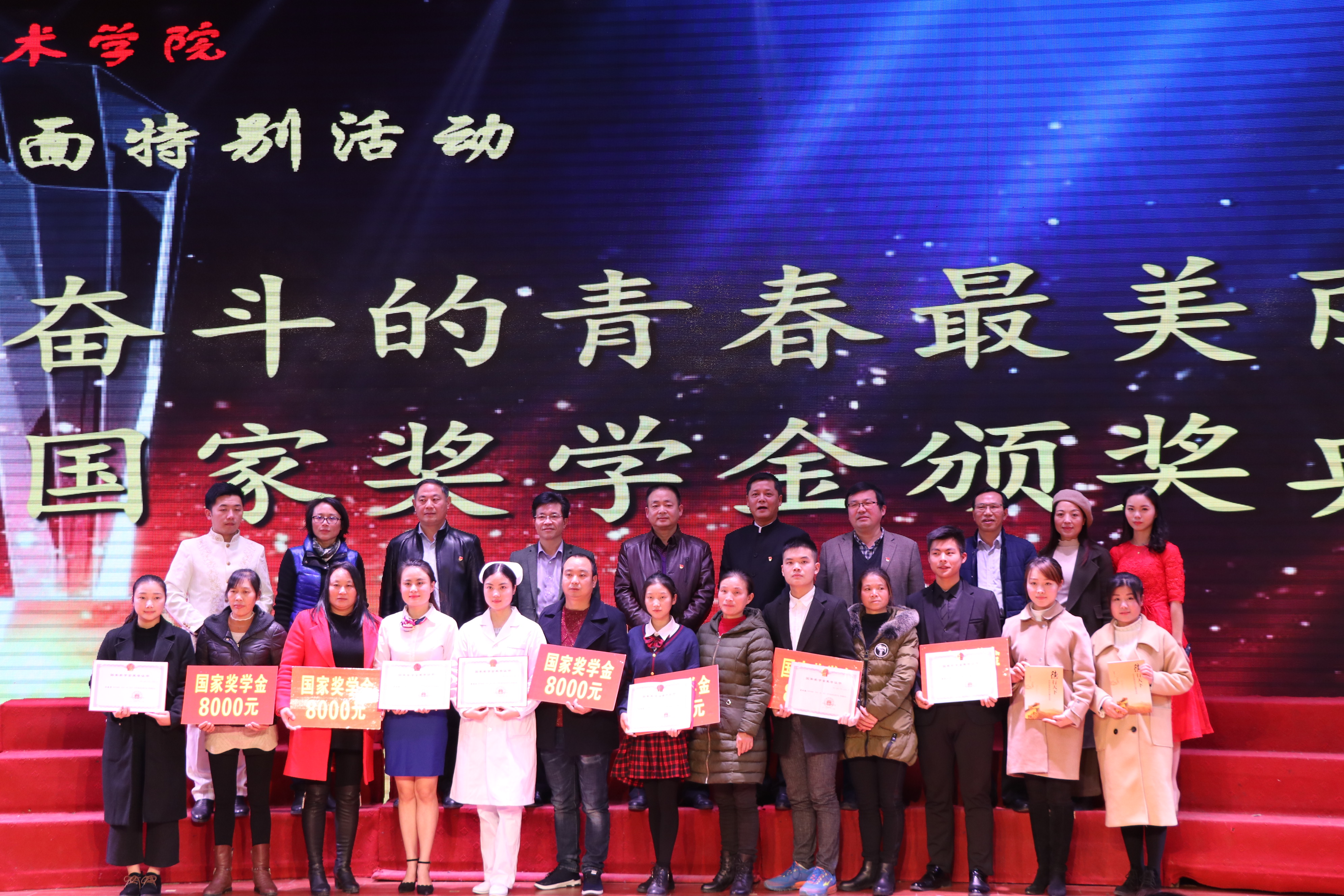 第三篇章以原创短片《榜样的力量》展现买球官网荣获国家奖学金的六位学子的获奖简历,激励青年学子向国家奖学金获得者学习。国家奖学金的颁奖仪式随即隆重进行,江西省学生资助管理中心副主任毛本其,买球官网党委书记宋晓文、校长杨云山为六位国家奖学金获得者进行了颁奖。全国护理技能大赛个人一等奖获得者曾莹玲、唐虎、黄盼毓三位获奖者表达了自己的获奖感言,当主持人邀请从六位获奖者家乡赶来的家长来到活动现场时,家长与获奖孩子的拥抱将活动推向了高潮,在场的观众都被现场气氛感染,许多教师和青年学子都都忍不住流下了感动的眼泪。当采访曾莹玲的父亲时,他表达了对国家、对学校的感激之情,并对女儿和现场青年学子进行了鼓励,现场观众也给予长时间热烈的掌声。