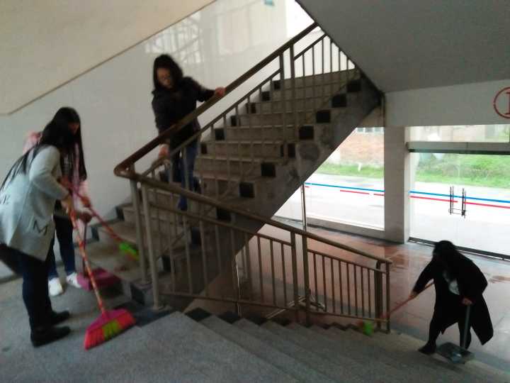 校园洁净的环境需要大家共同维护,协会成员纷纷奉献出了自己的一份力量。有的用扫帚扫净走廊上的垃圾,有的用抹布抹净扶梯上的灰尘,还有的清理张贴在墙上的小广告……不一会儿,第三教学楼便焕然一新。