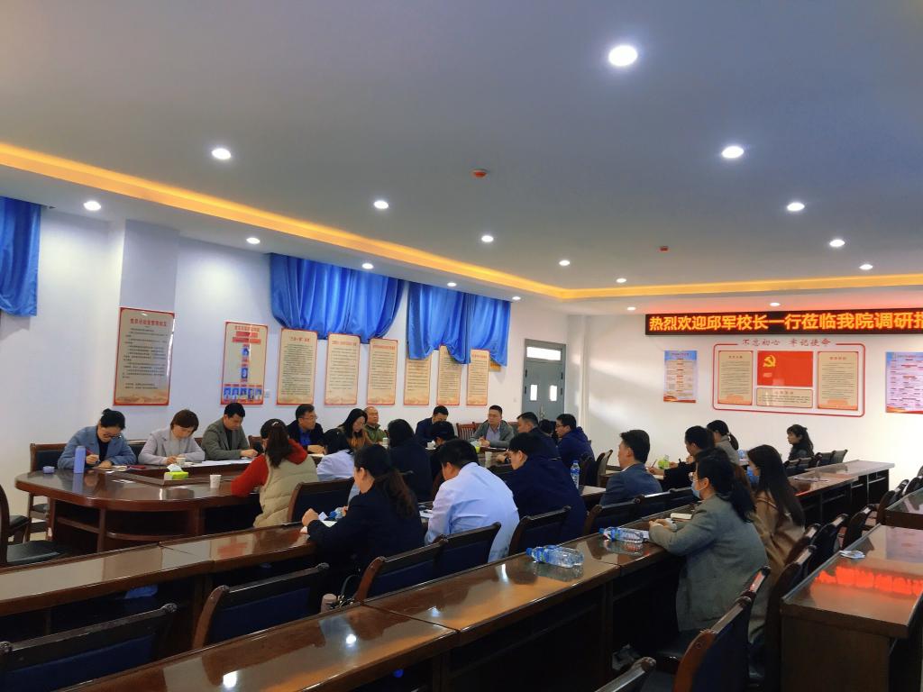 为进一步完善专业建设,提高人才培养质量,推进买球官网“双高”建设项目,落实“三比三争”工作,3月31日上午,校党委副书记、校长邱军,副校长易滨秀携教务处、发展规划处、党政办、人事处等部门负责人一行来医学院(附属医院)对学院专业建设进行调研指导。学院全体班子成员、教研室主任及专业负责人等参加会议。