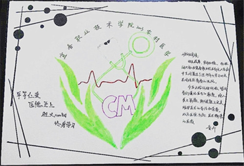 12级农医2班的班徽设计中,一双绿色的希望之手,就如医者般托起一个个生命。而听诊器、心电图及英文cm(clinica medicine)的巧妙融入,淋漓尽致地展现了临床医学这一专业的核心,传递了医生救死扶伤、医者仁心的光荣职责。