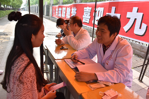 5月7日上午8点30分,在初夏的阳光里,由医学院组织开展的爱心义诊及健康咨询活动在校园门口拉开帷幕。基础深厚,经验丰富的陈丞老师,宁松兵老师带领五名学生志愿者组成医疗咨询服务队向过往的师生和居民们发放健康知识宣传手册,免费量血压,测血糖、测血型,检查颈椎腰椎……并认真询问他们的身体状况,热情为群众答疑解惑,为“职业教育周”增添了浓厚氛围。