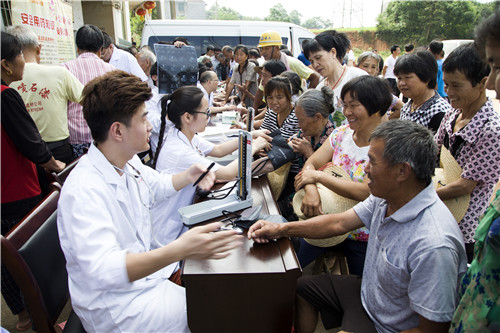 “血压115/75”,“您弯弯腰试试,看看行不行”……义诊台前,各项工作有条不紊。队员们细致地为前来问诊的群众量血压,测血型,检查乙肝两对半……老师们耐心地回答村民们各式各样的健康疑问,并针对复杂病症,建议村民们引起重视,及时就医……“村民们的健康知识还比较匮乏,村里的医疗设备也相对落后,很多农活带来的常见病得不到有效治疗。今天来这里的目的一是为村民们检查身体,二是希望能唤起他们的健康意识,劝说村民们有病及时就医,并去正规医院就医……”甘瑞华谈到。
