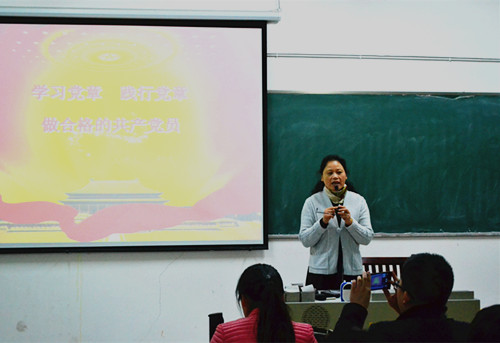 舒文以党章为核心,从几大方面全面、精辟、系统地为师生们介绍了党章的基本知识,强调了党员的权利及义务,明确了党的基本要求、基本纪律,详细阐述了入党的完整程序。她指出,每个党员都是志愿加入中国共产党的,“志愿”不仅代表一种愿望,更是指志气与心愿,是一种明显高于自愿的愿望。舒文满怀感慨地谈到:“入党近30年,每一次面对着党旗,举起右手庄严地朗读入党誓词,都是一次内心的洗礼,时刻警醒着我要做一名合格的共产党员。”她指出,每一名党员以及想向党组织靠拢的成员都应有“全心全意为人民服务,不惜牺牲个人一切,为共产主义奋斗终身”的觉悟,要端正入党动机,严格要求自己,时刻把握自己,时常反省自己,做一名有定力的党员。